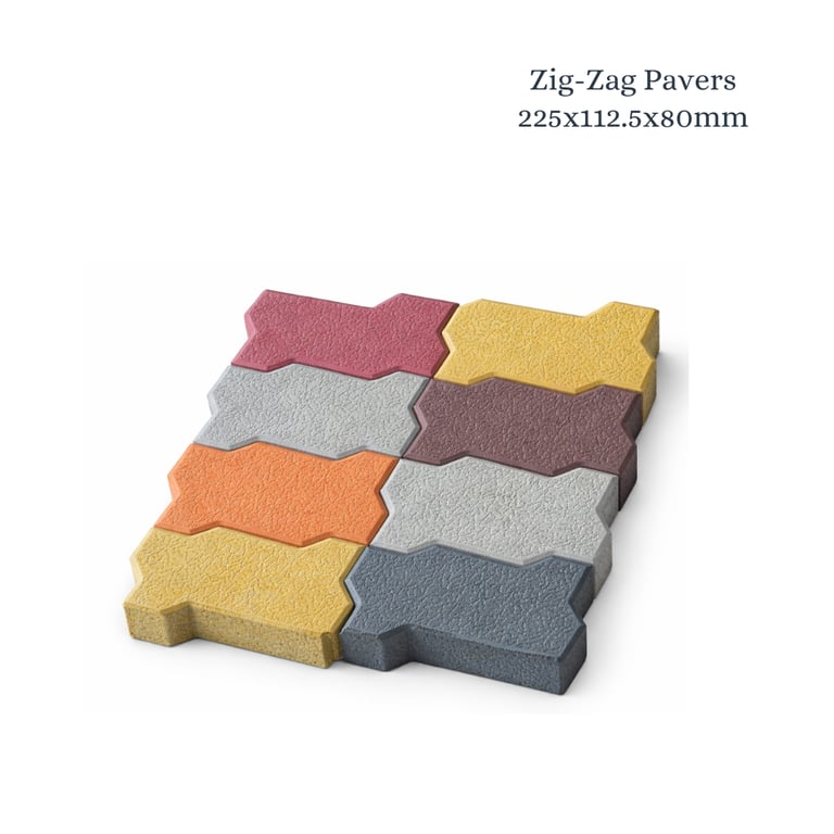 Zig-Zag Pavers are interlocking concrete paving blocks designed to provide superior load distribution and high structural stability. Their unique shape ensures strong interlock, making them ideal for heavy-traffic areas and long-lasting pavement performance.